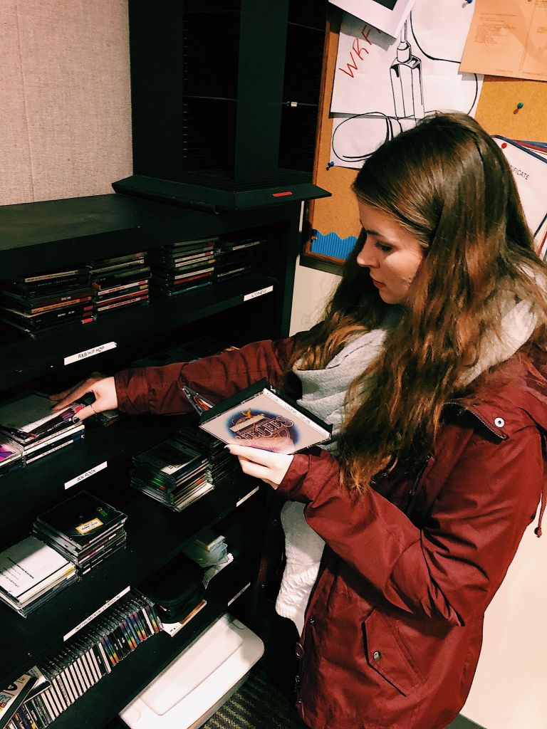 After Marion is finished with her script, she can go to finding music she needs for the theme of the show she is producing. Marion is looking through CD’s in the studio and trying to find Christmas genre music for the listeners to get into the Christmas spirit.