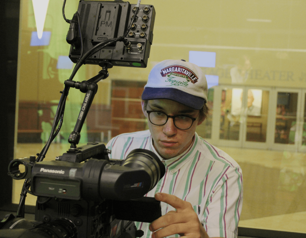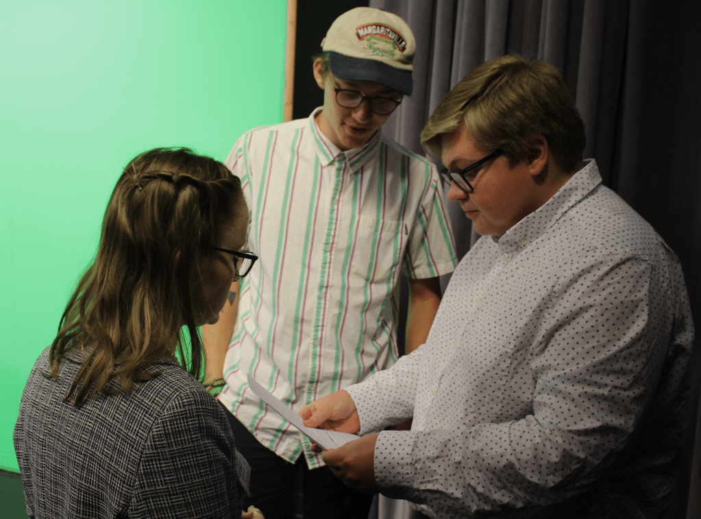 Laura Alyssa Platé (left), Joey Brovont (middle), and Hollis Meyer (right) do a quick once-over of the script in the television studio before setting up for their student news broadcast, the Four.Joey Brovont makes sure everything is in focus and crystal clear before the countdown to record the Four.That’s a wrap! Hollis Meyer (left) and Laura Alyssa Platé (right) celebrate a broadcast well done in grayscale, because the photographer may or may not have taken a picture that was overexposed. Who’s to say?