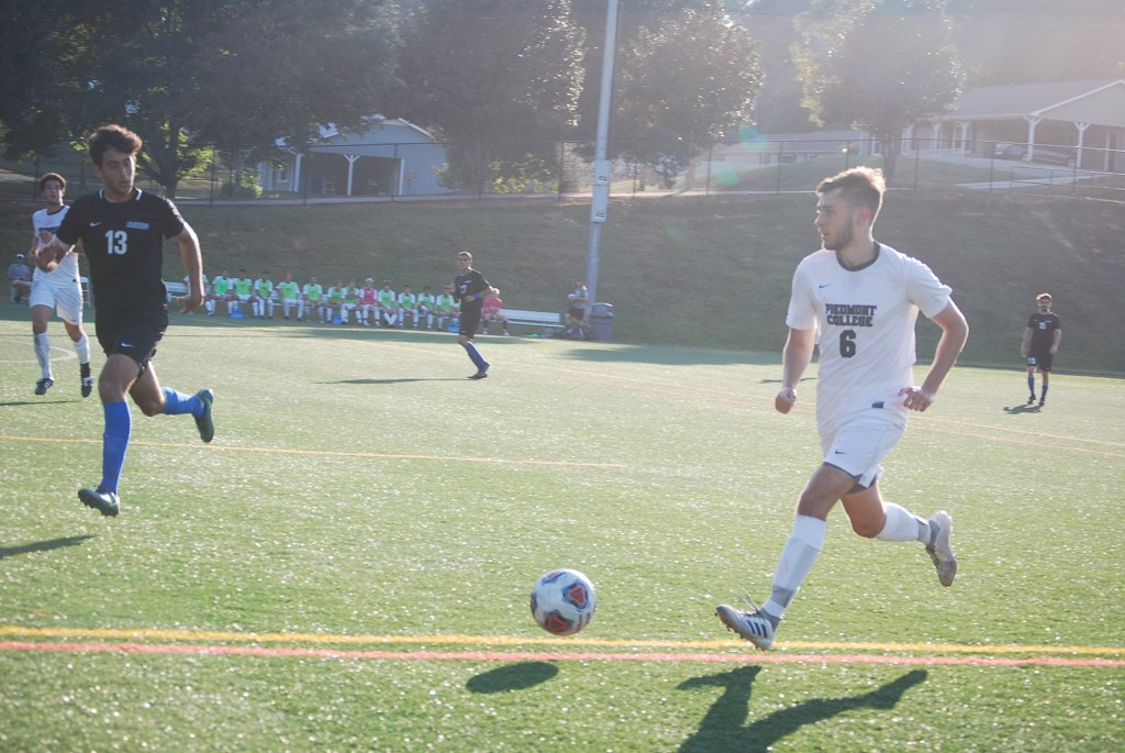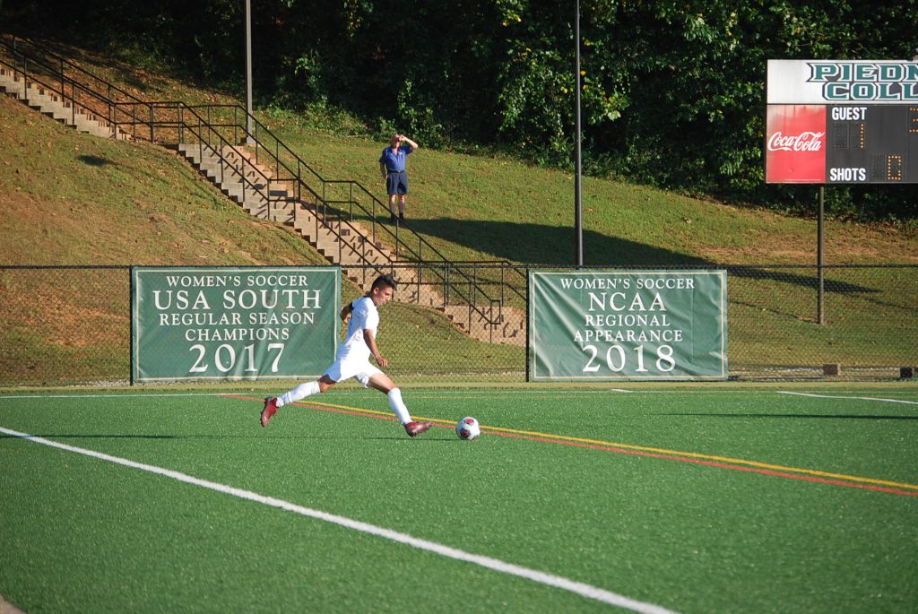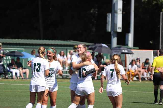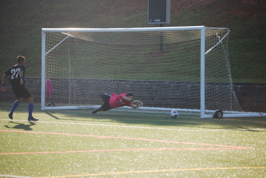Junior Midfielder Jose Linares taking a penalty kick right before half time. Junior Goalie Cameron Verona diving for a kick on goal. The ball ended up going wide right. Freshman Forward Jared Williams driving down the field.(Left) 13 Senior Devin Haupt, Freshman 98 Mandy Weinhart, (Middle) 32 Abby Judge, 10 Anya Olsen, and (Right) Cassie Kurt, all celebrating after a goal.