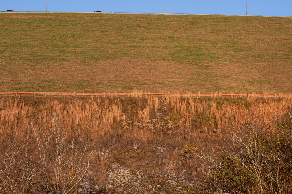 This shows a wide perspective of a hill at sunset at Buford dam park around 5pm