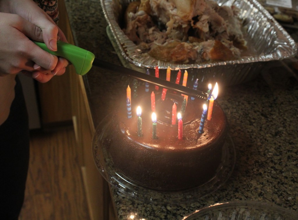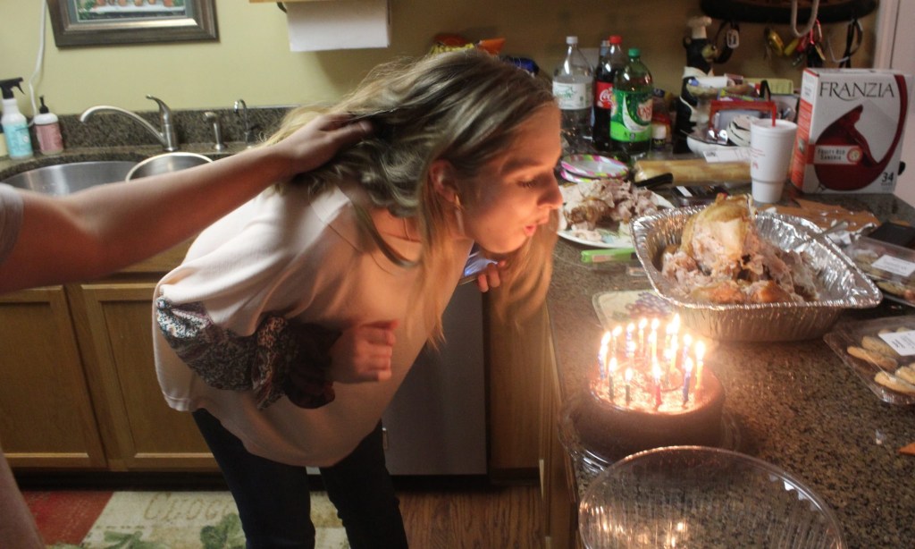 With the Thanksgiving holiday quickly approaching, Izzy Ott (right) invited several of her closest friends to a Thanksgiving celebration in her lake house. Here, she and her boyfriend, Luis Dunn (left) prepare the Friendsgiving turkey before their guests arrive.Fresh and no longer frozen, the guest of honor of Ott’s Friendsgiving is ready to be passed around and chowed on by their guests.The Friendsgiving gathering served two purposes for Ott. Not only was it a time of gathering and giving thanks to friends, it was her 20th birthday.Surrounded by some of her closest friends, Ott lights the birthday candles that represent another 365 day trip around the sun.With the aide of her boyfriend, Luis Dunn, Ott blows out the candles of her cake. As she does, the friends surrounding her sing her a happy birthday tune to ring her next year.Once the friendly festivities had wrapped, it was time to clean up. However, it wouldn’t be a Friendsgiving attended by photographers without an artsy portrait.After the cake is cut, the silliness truly begins. Dunn tries on a jacket that proves to be two sizes too small for him and decides to savor the moment by calling for an impromptu modeling session.Samantha Carvallo (right) and her boyfriend Garrett Stafford (left) have an animated conversation that required the use of audible hand gestures.Alyssa Gibson stares at the group of gathered friends with love and affection as the night of celebrations continues on.“I’ve never had a Friendsgiving before because my friends never believed in it and this was honestly the best night ever,” Ott said. “I can’t thank my friends enough for bringing me into their ‘family’ with open arms.”