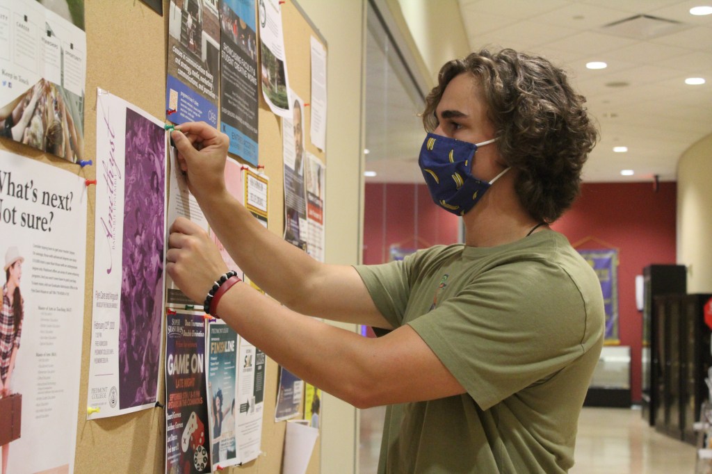 6.Noah Aaron hanging a flyer on the Swanson Center bulletin board.