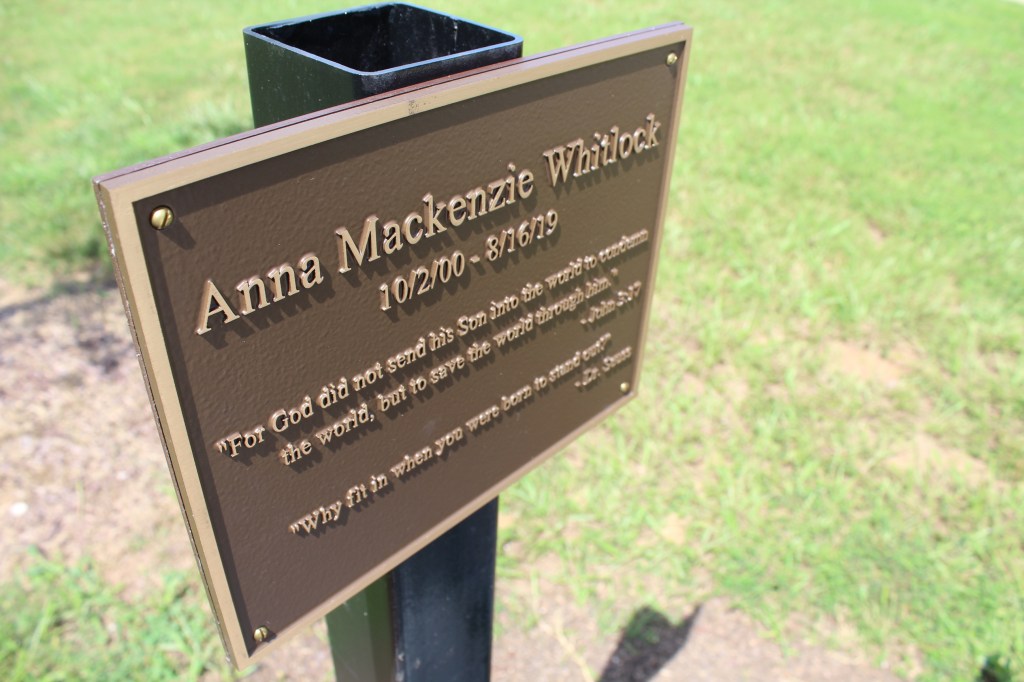 - Late student Annas’ plaque at her bench, Alyssa Hall