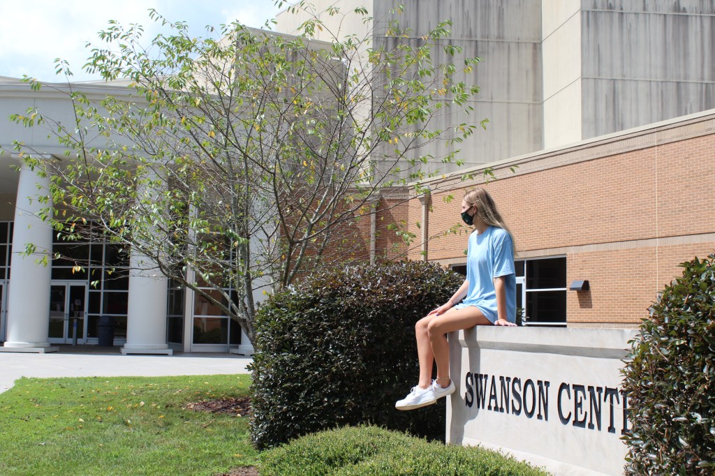 - Mass Communications major, Alyssa Hall, sitting on Swanson Center sign, Martin Gravely