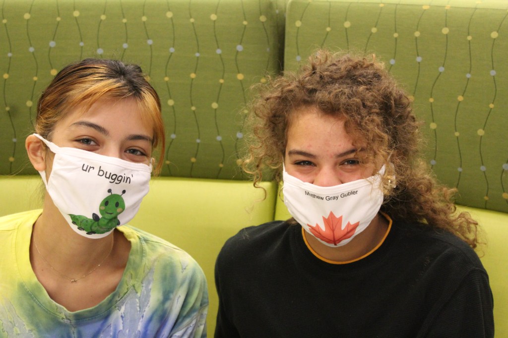 - Pictured above Sophia Delgado (left) and best friend Sam Seymour (right) sit at the tables in the commons to get away after doing homework. Also pictured their cute masks at which they got to create at the event they attended, hosted by Piedmont College.