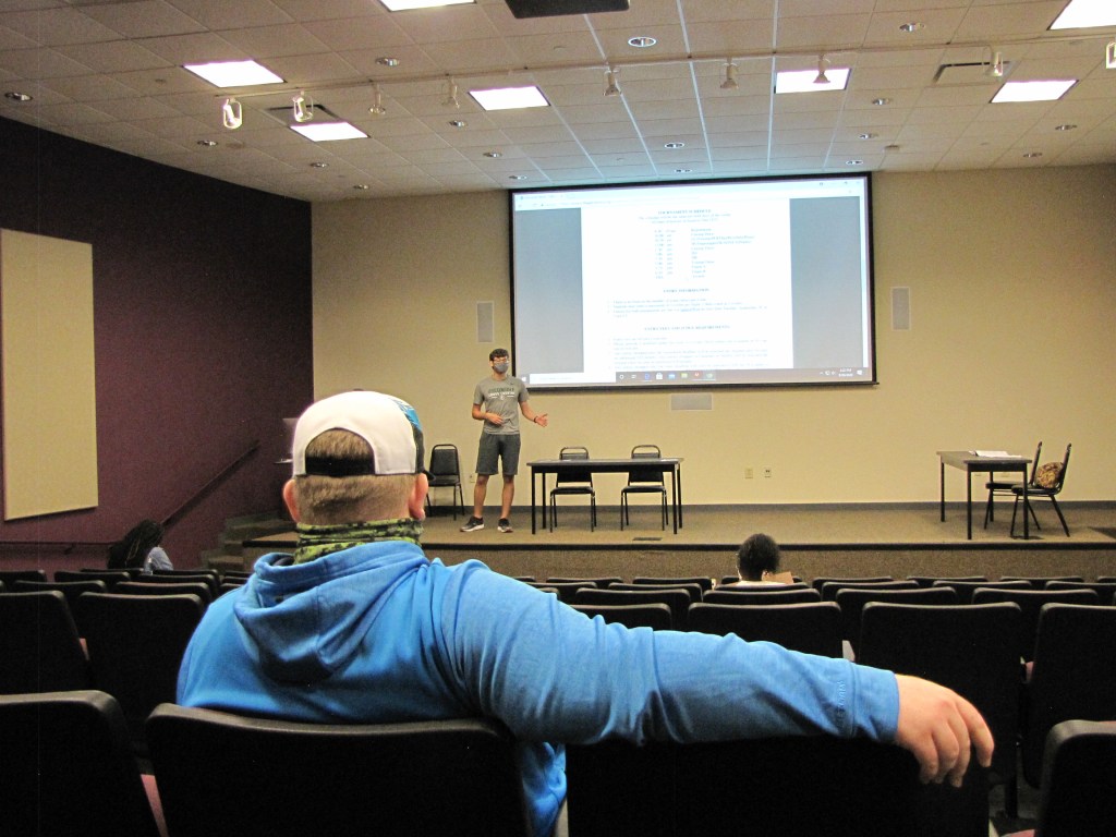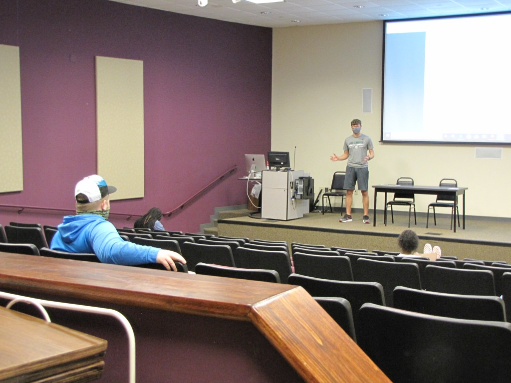 - Speaker on the stage in Swanson Center’s public speaking room practices his presentation in front of a few of his colleagues