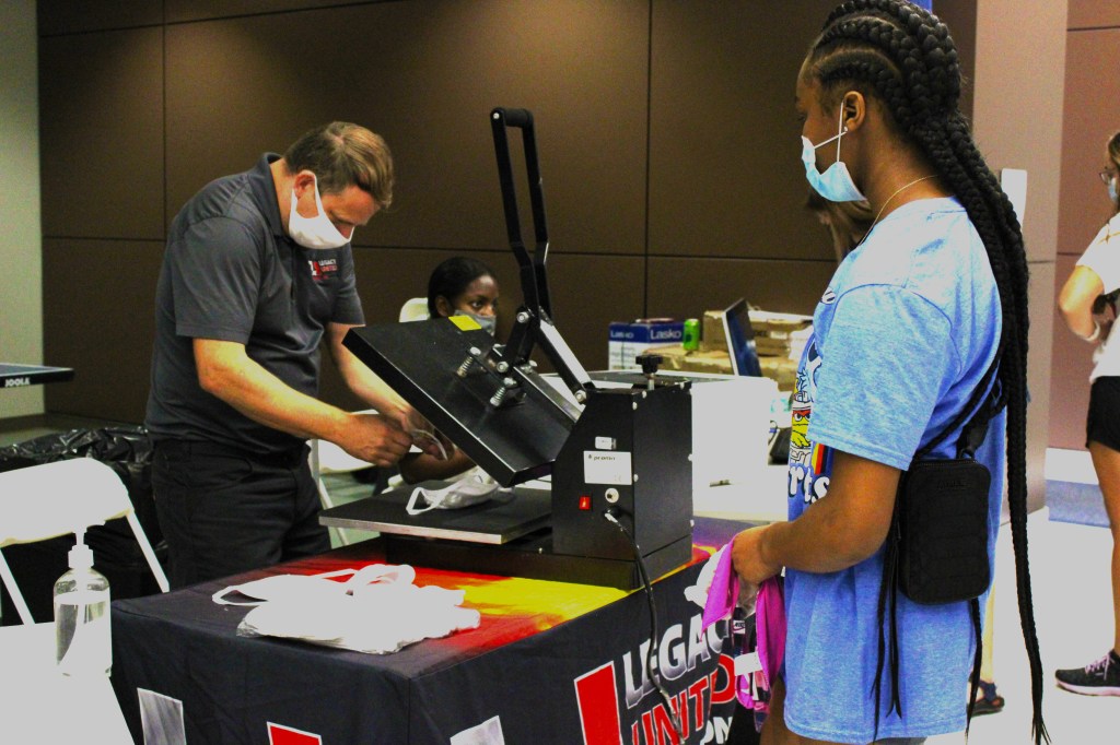 2. A student watches as a new mask is printed with her design. Piedmont College hosted this event as a fun way to encourage students to wear masks.
