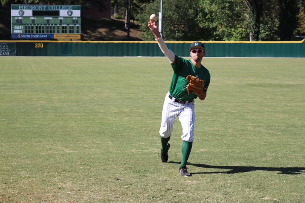 Senior, Tyler Sheley, seen making a throw from the outfield. Making good accurate throws is a key part to the game of baseball.Junior, Conner Jelley, gratifying his teammate after a spot on throw for a tag. During the game of baseball, it is important to have good energy on the field.