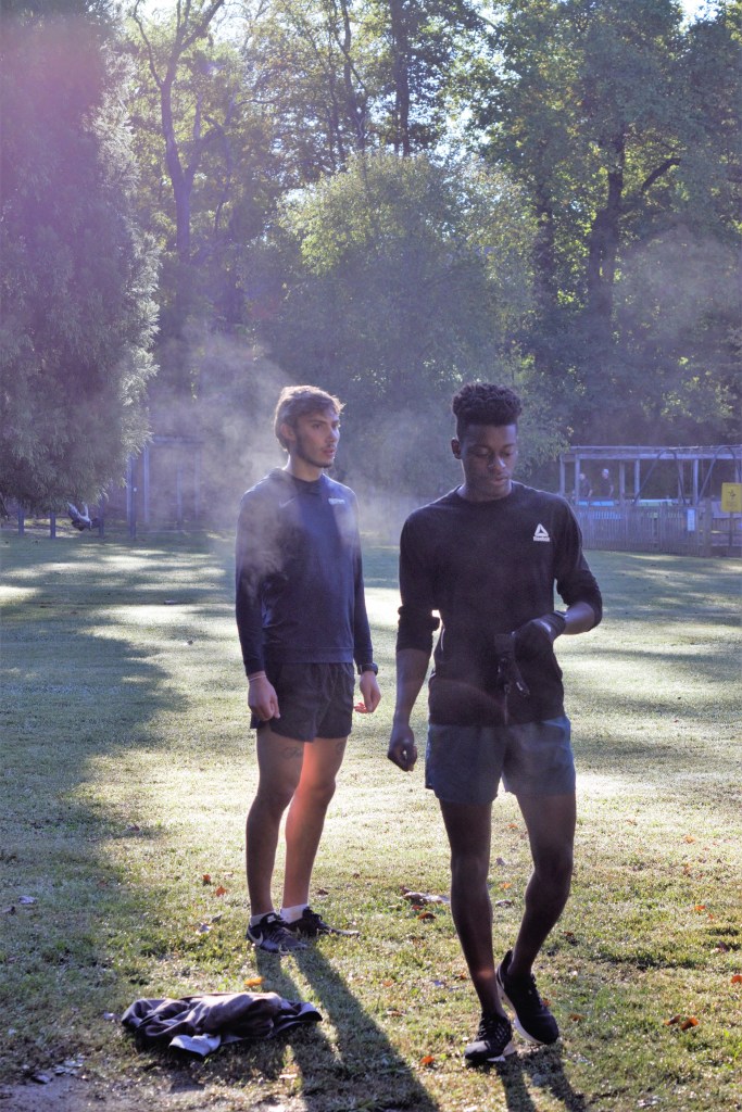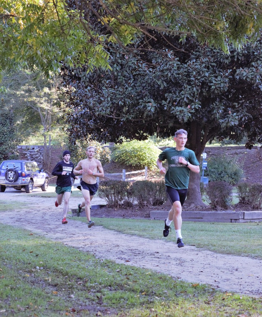 Connor Creedon(left) and Darius Smith prepare themselves for a workout. running workouts often don’t involve weights, rather they involve timed intervals to increase aerobic capacity.Cole Elrod(right), Roy Harkins(middle), and Jeremy Halbrook(left) finishing their last rep of a workout. Their workout consisted of 1x1000meter and 4x500meter intervals.