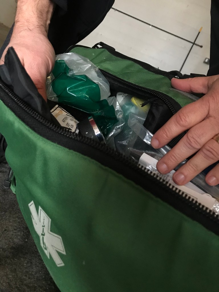 - Close-up: Before every fire and medical call it is a must to check in the medical bag that all items are accounted for.