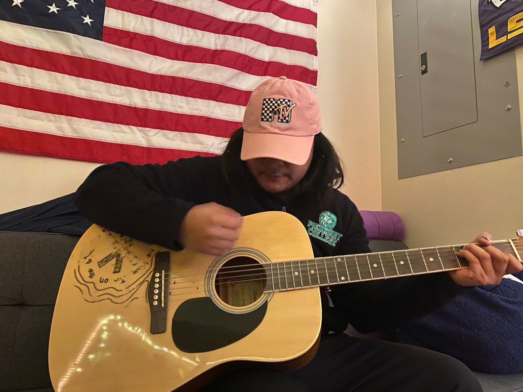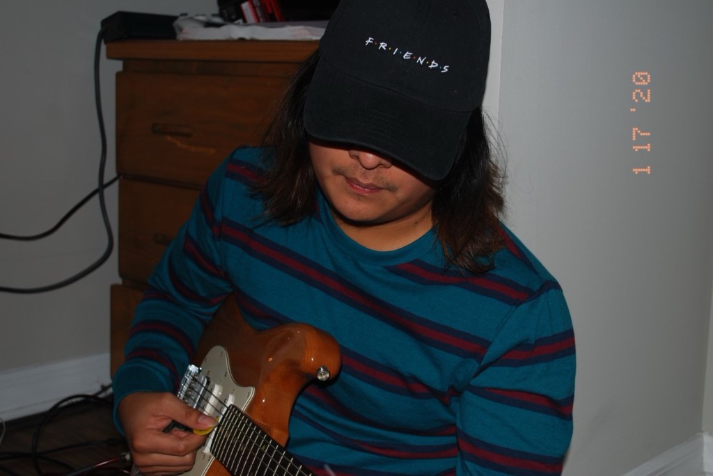 Luis spends four hours a day playing guitar whether it’s for school, pleasure, or his own music. It’s his favorite thing to do at any time of the day.Luis resting after a three hour jam session.With guitar as a major Luis always needs his laptop and guitar. Falling asleep with his guitar in hand is a regular site for his roommates.