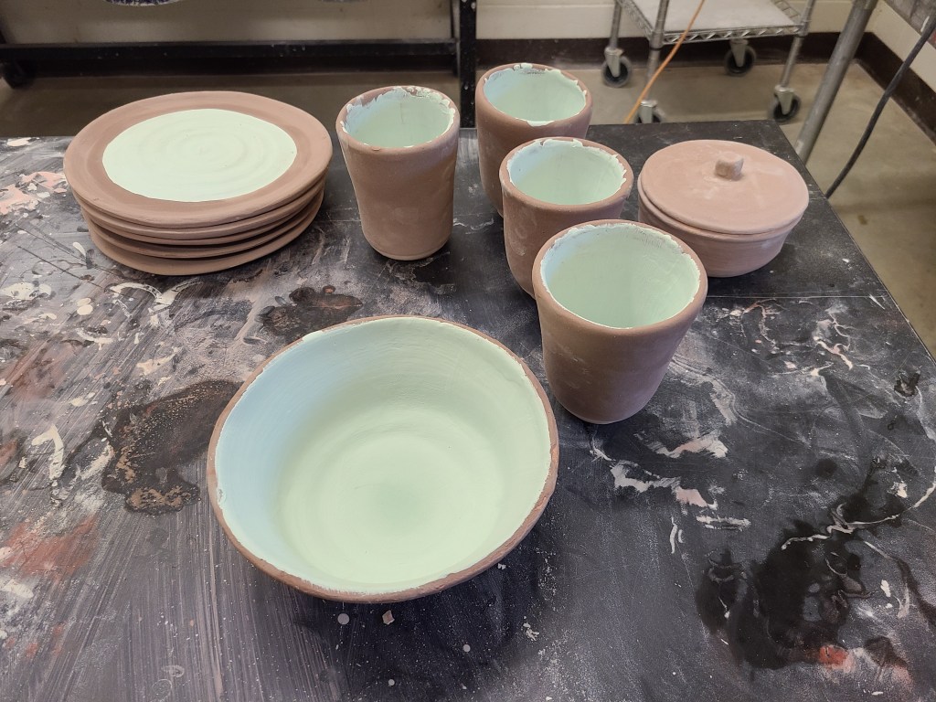 Ready for the glaze are a handful of plates, cups, bowls, and a small pot. Theyare carefully glazed in order to avoid complications in the kiln.