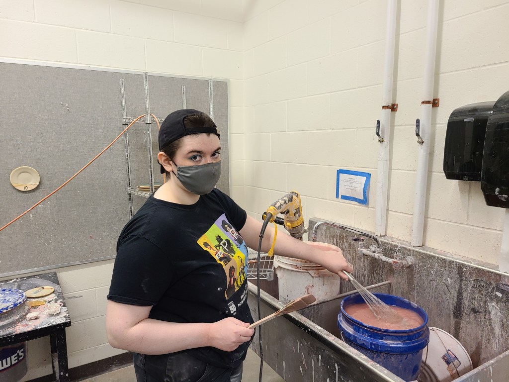 Jude Worthington cleaning tools and getting ready to glaze their pottery. In their hands are a whisk and power tools used to mix the glaze before use.