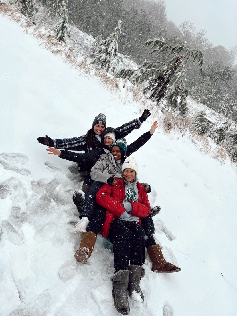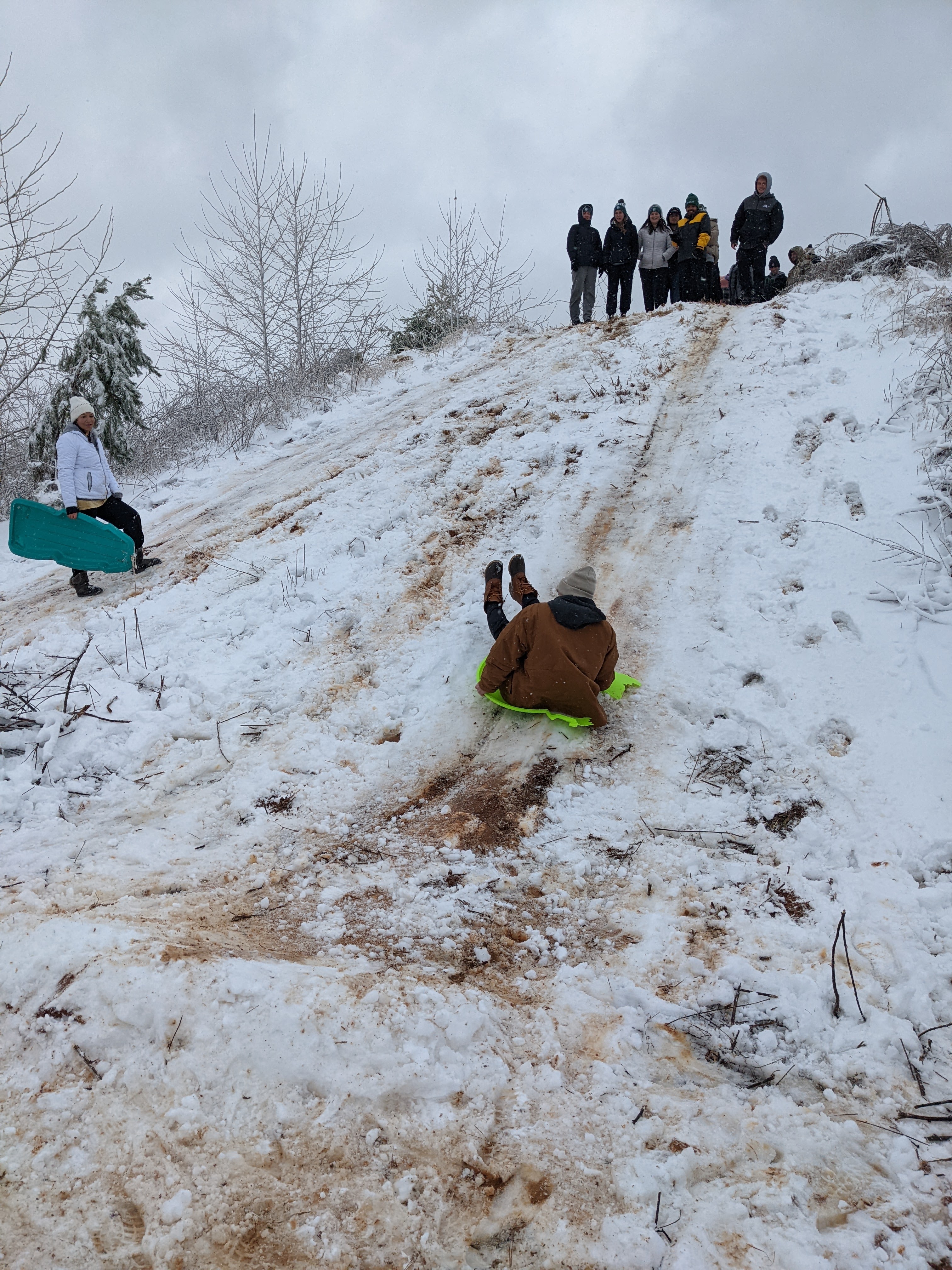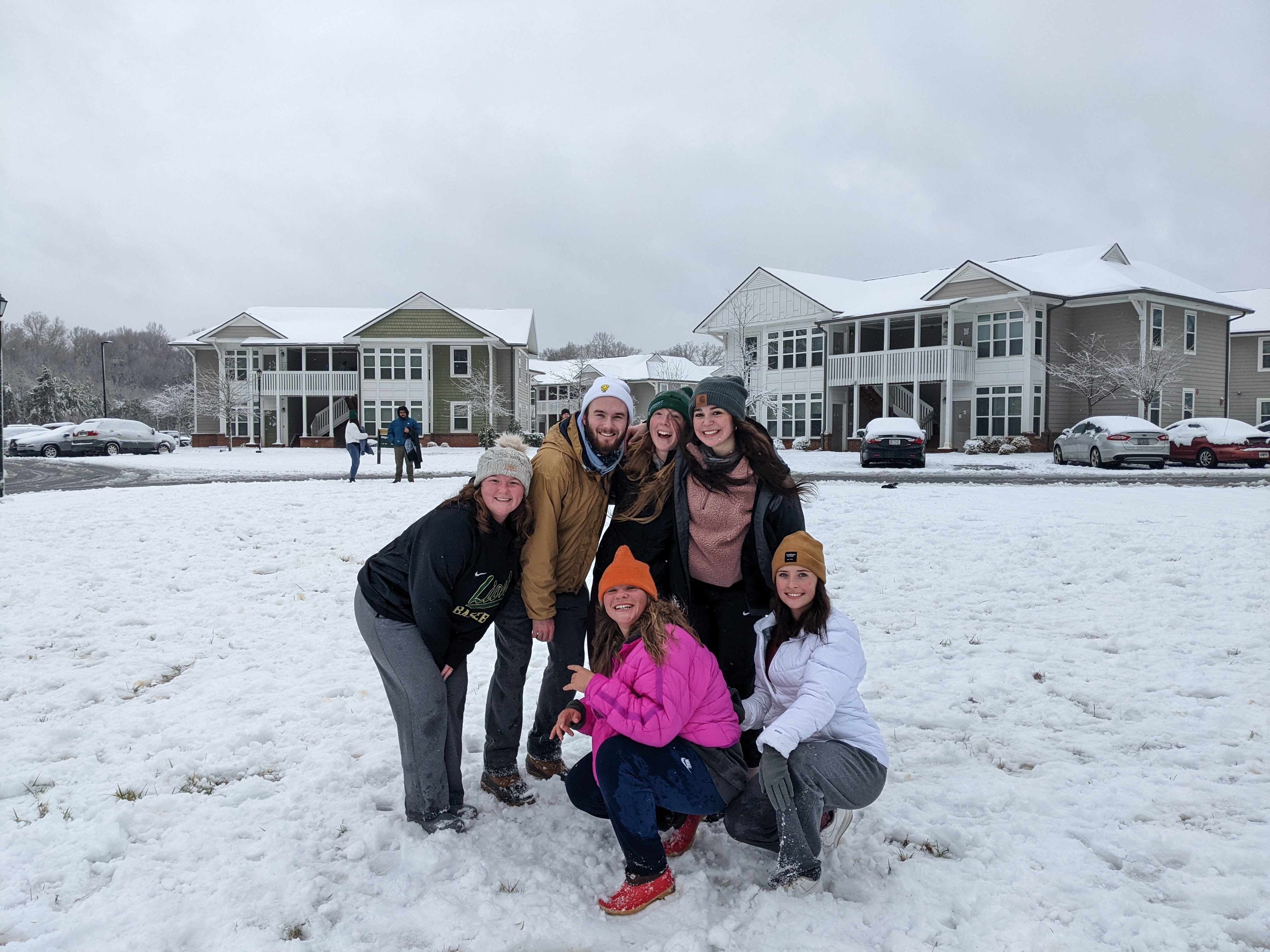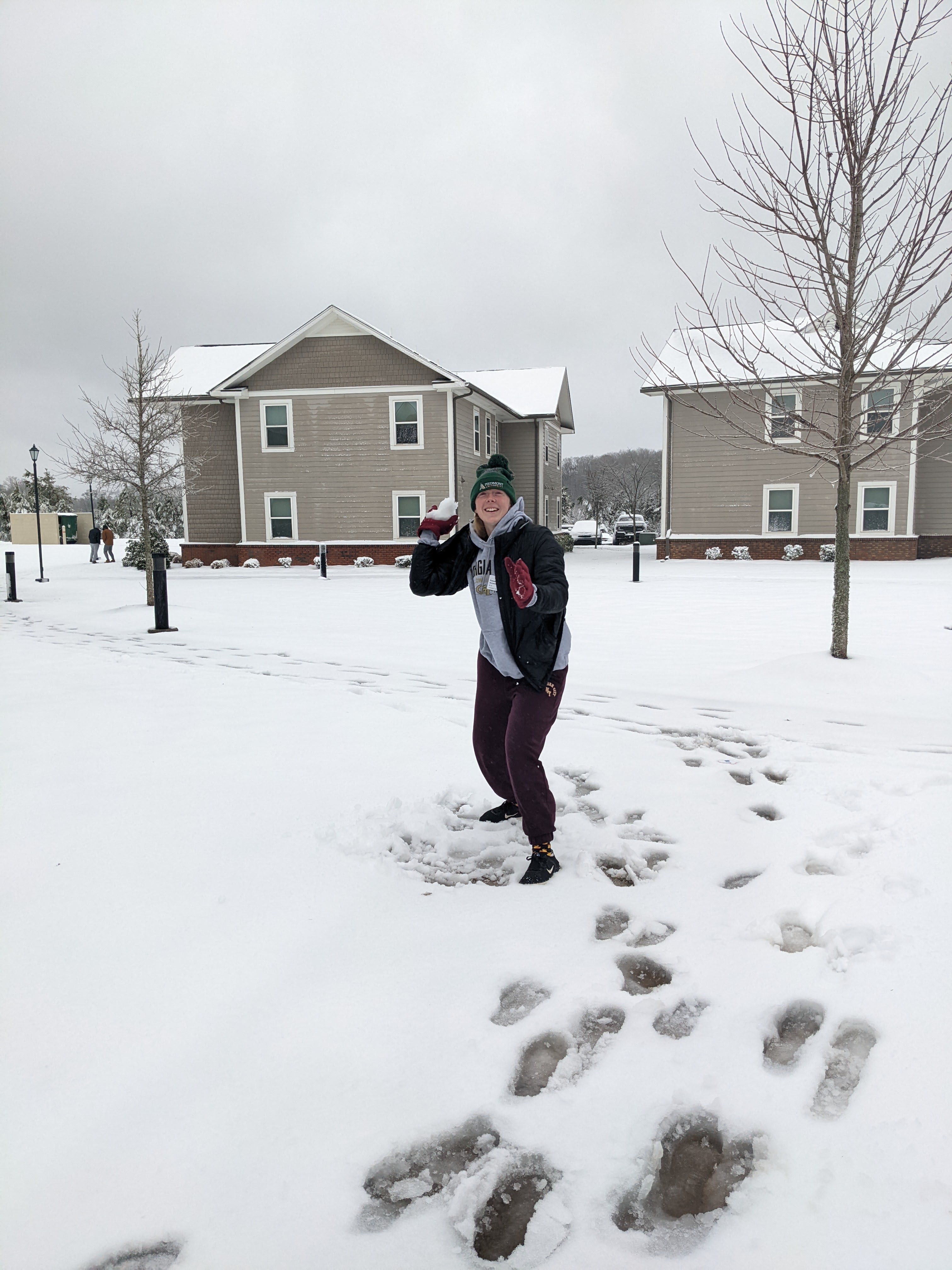 This is a photo of my residents enjoying the snow!A few of my friends on my women’s tennis team posing after playing football. This is a picture of the village entrance that I took for RA stuff. I was walking back to the village because my car was covered in the snow.We were sledding down the hill in the back of the village. People in the village playing football. My best friend trying to throw a snowball at me. A close-up of the trees in the village.