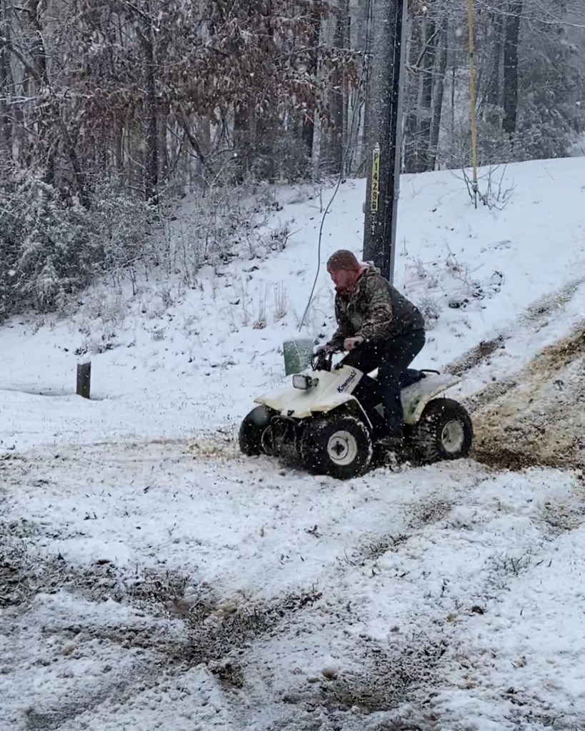 Cutline: Brian Wood rode a 4-wheeler down the hill at his house on January 16,2022. Since there was nowhere to go due to the roads having snow on them there is only one thing to do and that is to get out the 4-wheeler and ride around in the snow.