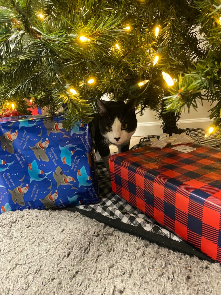 Cutline: Arrow sneaking around the Christmas presents underneath the tree on December 16,2021. Due to the fact he is not allowed to climb the tree, he has decided to sneak around underneath, thinking that no one will notice him.