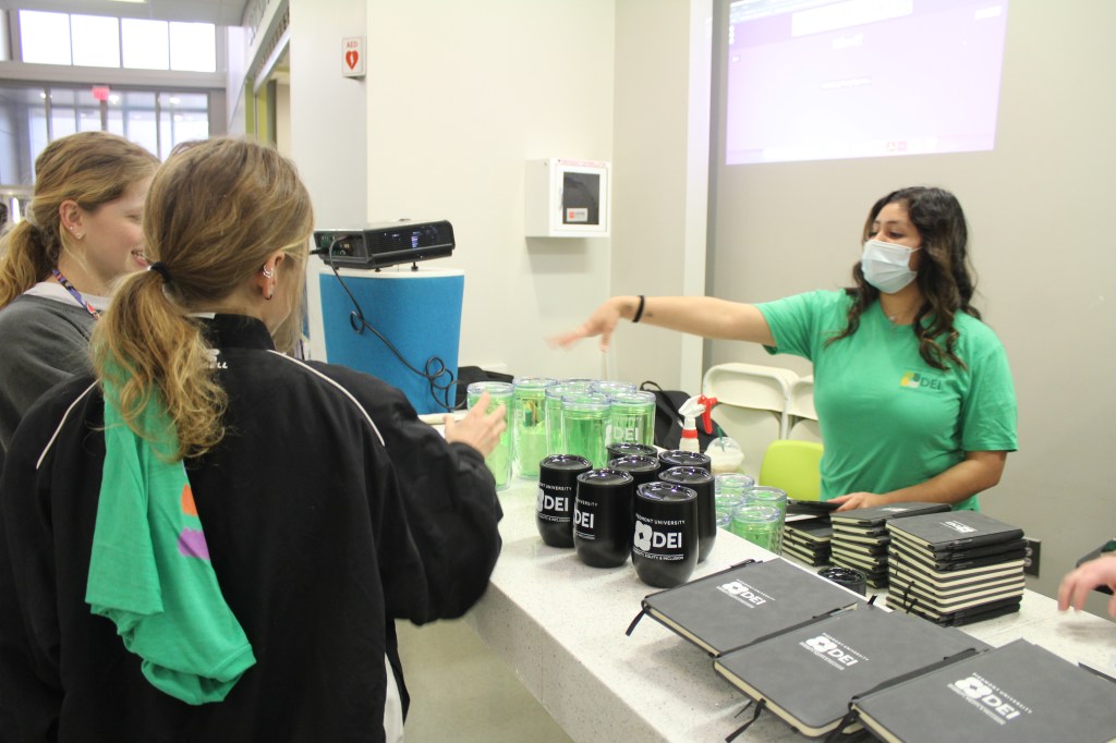 Brenda Diaz, a student at Piedmont University, gives out cups to students on Diversity Day, February 17th. The Demorest campus event, held in The Commons, is to show the importance of different communities coming together.Silas Sandals, a student at Piedmont University, handing out shirts in celebration and awareness of Diversity Day. The event, held on February 17th, was held in The Commons on the Demorest Campus of Piedmont University.Caden Nelms shares a conversation with Professor Joshua McGowan on Diversity Day, a celebration of differences in culture and community. The celebration, held on the Demorest campus of Piedmont University annually, was held February 17th in The Commons.