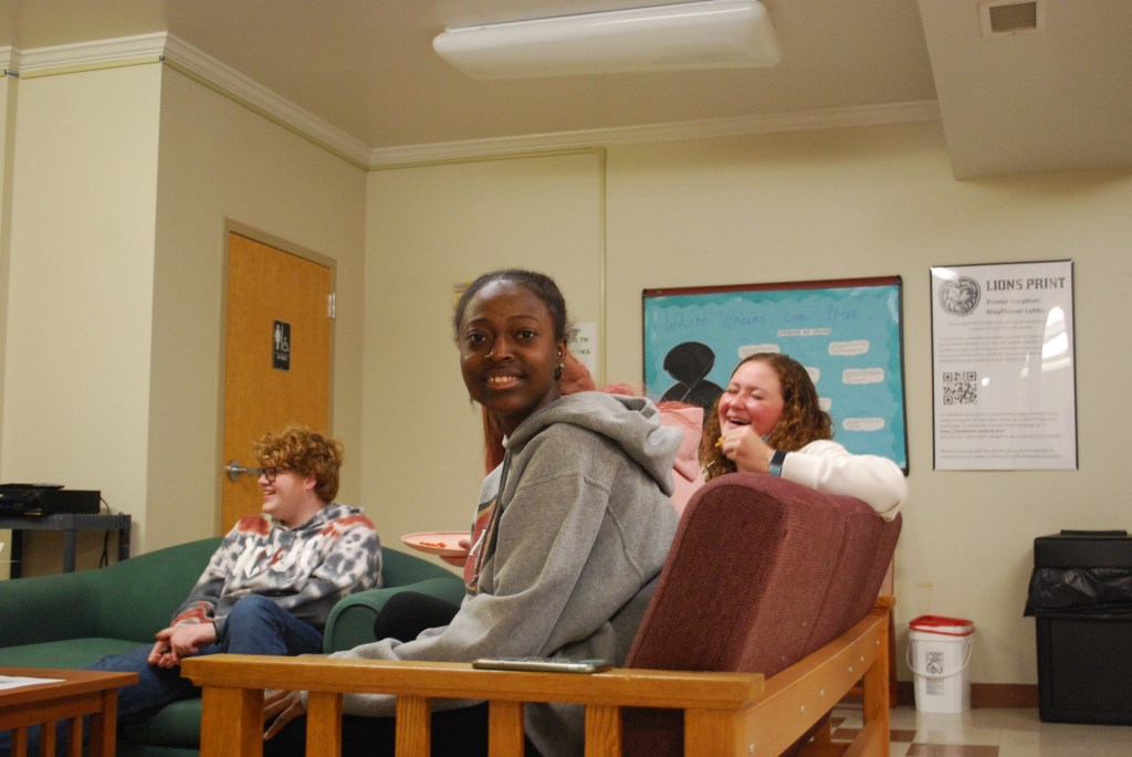 Pictured above is a small group of students laughing their way through a residential life event called Presidential Trivia in the Mayflower lobby on February 21st, 2022!