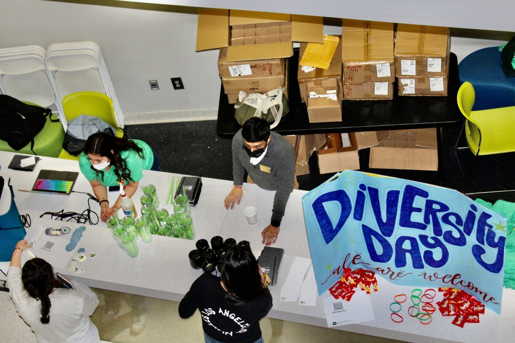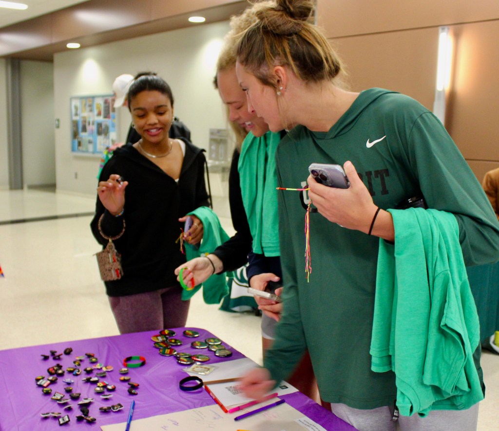 Piedmont Student-Athlete Lu Woolfolk holding up her Diversity Day t-shirt. She also signed the DEI pledge which helped her get this t-shirt.Piedmont Student, Brenda Diaz, and Piedmont University’s Hispanic recruiter for admissions Gabriel Gutierrez were helping out at Diversity Day. They were giving out small tumblers and cups, and they were giving out other information about Diversity Day. A few of the Piedmont Women’s Basketball team looked through the gibbets to see which was their favorite one.