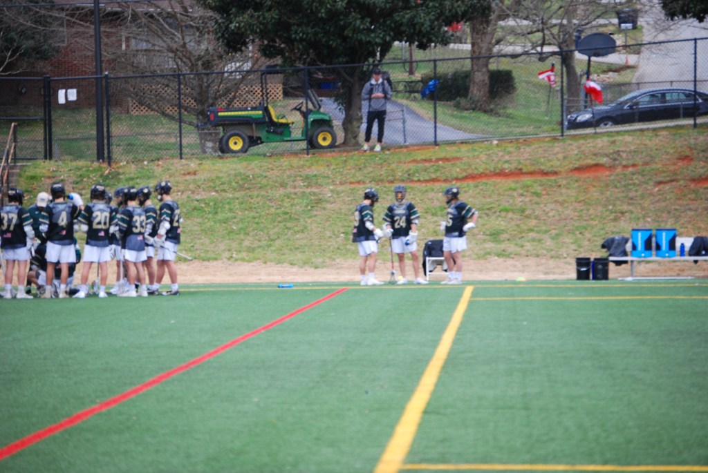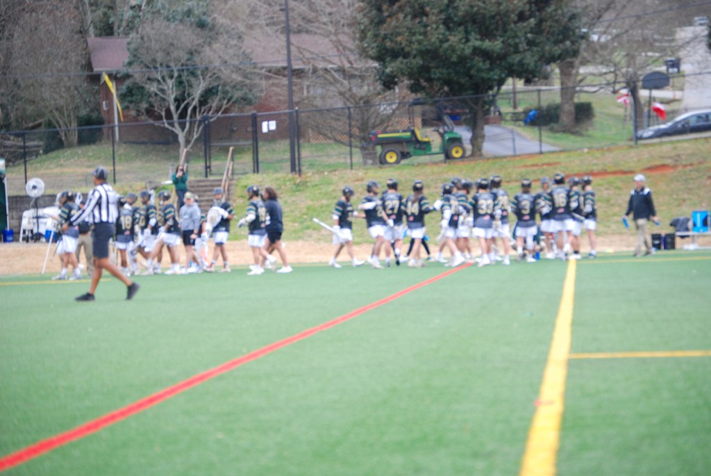 In this picture you see the referee running along said the players and watching number 18 Nazhir Ellerbe who currently has the ball. He is watching to make sure either player does not make any illegal hits or trips while trying to score. In this pictcure you see all of Piedmont University men’s lacross ,gatherd around after hudding in a group to go over a play. All players injured or not were required Here you see players 25 talking with 2 other players, making a plan to help them win the game. After talking and the game resumed player 24 Chris Pennenbacker helped his team score 2 more points. In this Picture you see numbers 25 who is Austin Vaughn ,34, who is Mason Graves and last, number 38 Zack Schramm running after the man with the ball. The white team is the people they played against and won.