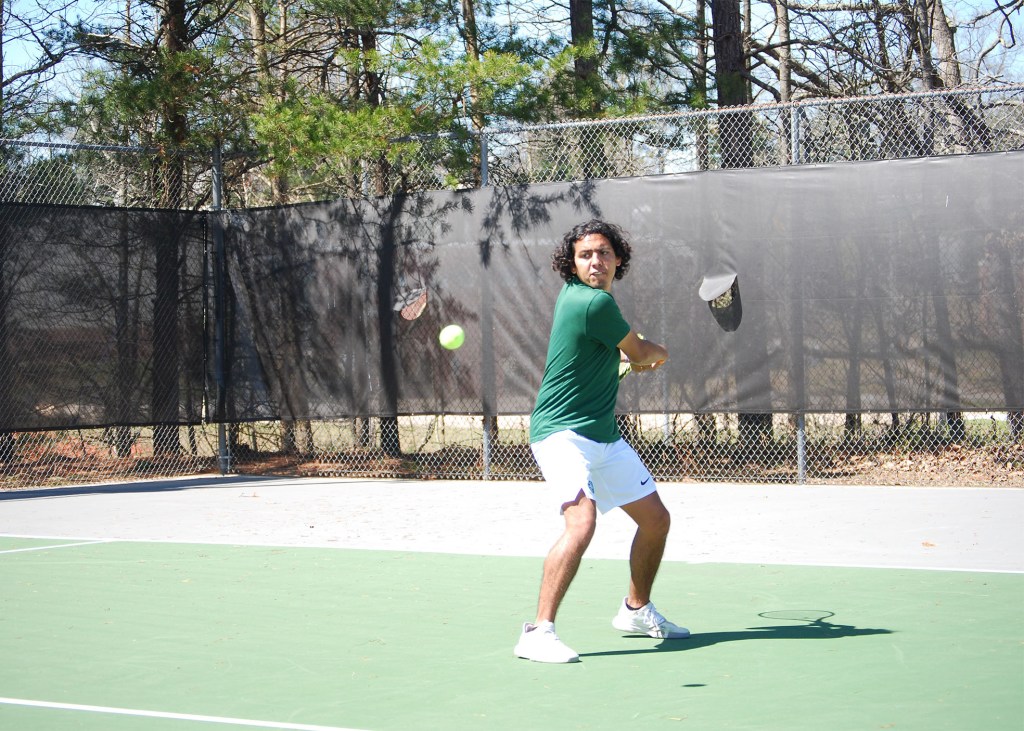 Piedmont Women’s Tennis doubles team Kaitlyn House (left) and Ali Wilson (right) congratulate each other after picking up a point in their match. The duo faced Eboni Montague and Maira Teurel of Johsonand Wales University and put up a valiant effort.Sophomore Leo Galarza charges to the net to hit the ball. His efforts resulted in a point, helping to beat his opponent from Johnson and Wales and give Piedmont another set win.Leo Galarza looks to attack the ball and send it over the net. He swept his opponent James Hagedoorn in two match sets. It was Galarza’s first clinch of the season.Freshman Ryan Raugh sets his eyes on the ball as he looks to return it over the net. He defeated his opponent Jonathan Millwood in two match sets.