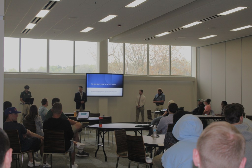 Pictured Tiffany Long helping out her group answer questions about their research “Learning without tests: The students Experience”. Tiffany gave the audience quick and thorough responses. Pictured Julia Demello playing the symbol to the soundscape she created. The perfect timing was everything during her unique presentation “Storm, Story Telling Through Natural Themes in Music”.On April 6th 2022, Piedmont students all around campus participated in the schools yearly symposium. Pictured is Mario perezcassar, Ryan Hanson, Kelton Kieschnick, and Blake Silvey ready to present “Do injuries affect ticket sales”.