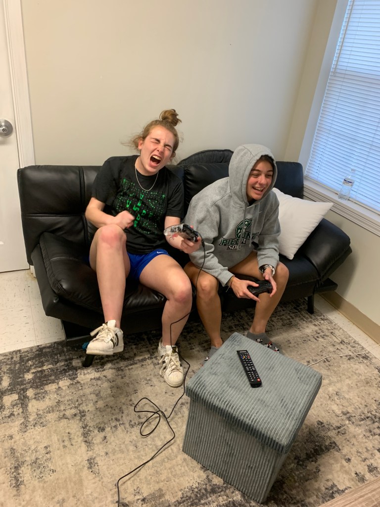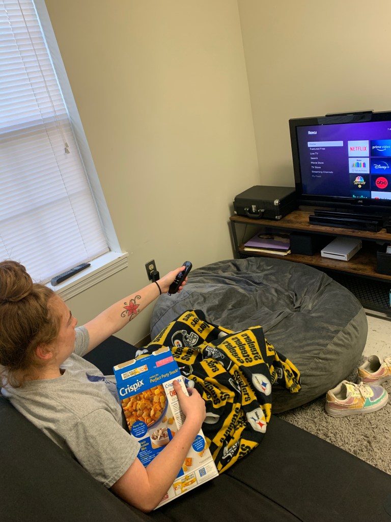 Madelyn Paris found herself cracking open her books and studying more than usual this week as she prepares for her upcoming finals. As important studying is, it’s just as important to get outside and be active! Madelyn enjoys riding her scooter around campus to help relieve some stress. Early morning classes are never fun. Even though she’d much rather be sleeping in, Madelyn makes it to her morning classes to make sure she has all the information she needs to be successful on her final exams. While studying for final exams is important the last week on campus, so is packing! Madelyn spent time away from her studies to pack up her dorm room while she also prepares to move out for the summer. After a long day of classes, Madelyn likes to kick off her shoes, grab her favorite box of cereal and lay back on the couch while watching some Netflix. Friends help friends during finals week! Not only is studying together always a good idea, but so is reliving stress by yelling at the PS4! Madelyn joins Madi Gallarelli as they both play video games after a study session. Staying up all night to study is for some students, but not Madelyn! She makes sure she is in bed at a decent time to make sure she’ll make it to her 8am finals the next morning!