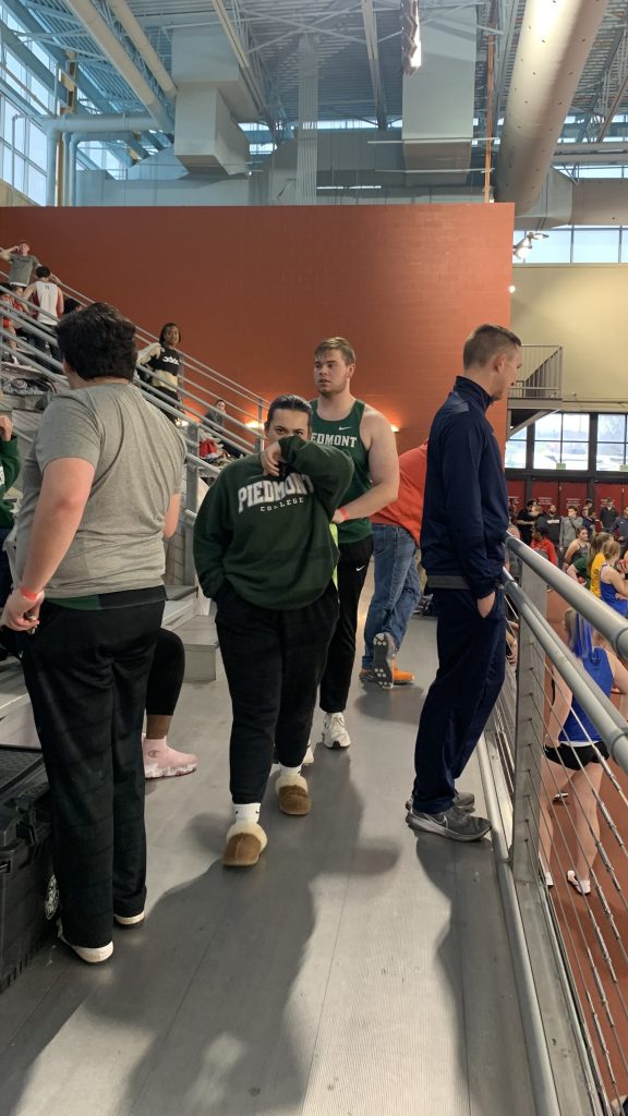 Freshman Ethan Jackson and Senior Noah Irwin watch from team camp as the rest of their teammates compete on the oval at the Samford Bulldog Open on Saturday, Feb. 11th, 2023 in Birmingham, Alabama. While waiting for the next event to start, Jackson is preparing to chow down on a turkey sub that the facility provided for the team. Junior Reaghan Anderson and Freshman Kerrigan McClain walk back to team camp after completing their throwing events for the day at the Samford Bulldog Open on Saturday, Feb. 11th, 2023 in Birmingham, Alabama. While walking, Anderson catches a whiff of a smelly competitor and covers her nose.