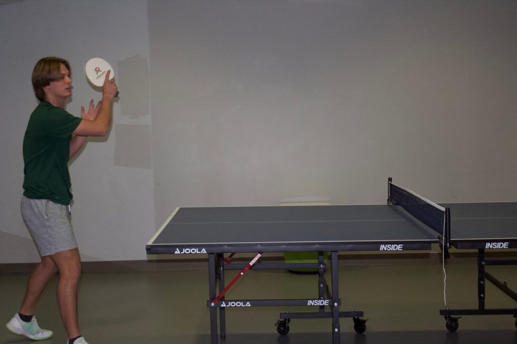 Kody Dills a junior applied health science major looking very competitive after hitting the ping pong ball back over to the other side as he was playing in the ping pong intramural championship held on February 13th in the student commons.