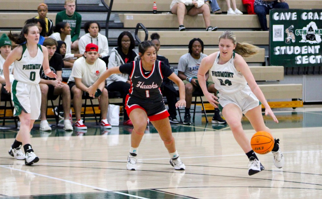 Piedmont junior Bentley Cronic (#24) driving past a Huntingdon defender to score. The lady Lions would go on to beat Huntingdon 97-71 to advance to the CCS semi-final match.