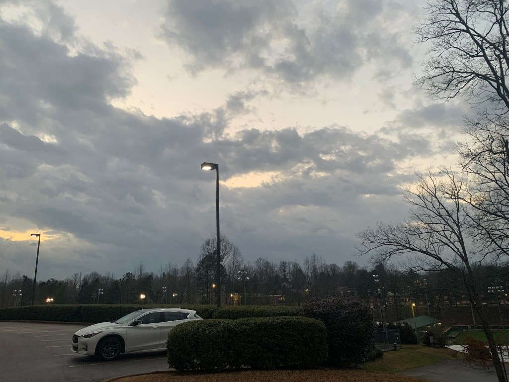 As I walked around campus all day the gloominess was so strong that it put a damper on the day as a whole. I was on my way to dinner that tonight, I noticed the perfect symmetry of the trees in the background. I took this photo with the sky in the background as well because of how beautifully lit it was as well.