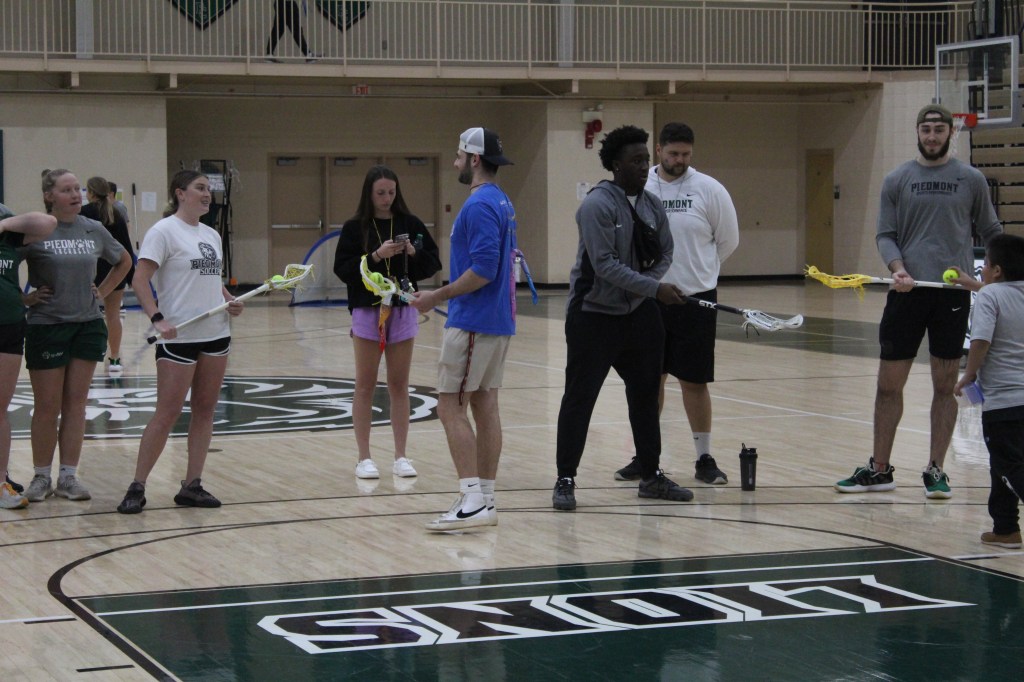 Piedmont University’s men’s tennis player Silas Sandles (left) and Piedmont University’s athletic director Jim Peeples (right) looking on as theywatch other Piedmont students with their pals. Piedmont hosted the Piedmont Athletic Lions (PAL) games on Friday, March 24th, 2023 in the Johnny Mize Athletic Center.A few elemantary PALs took a break from all the games and activities to get their faces painted by the Piedmont University student volunteers. Each volunteer allowed the kids to pick up to three colors they wanted their painting to be.A couple of Piedmont Pals taking a break in Cave Arena as their PALs ate lunch (from left to right: Maggi Spratlin, Kaylee King, Ashley Scott, JD Kuchta, Devin Dean and Dalton Meeler). Strentgh and Conditioning coordinator John Delf was also in attendance to take part in the school-wide event.