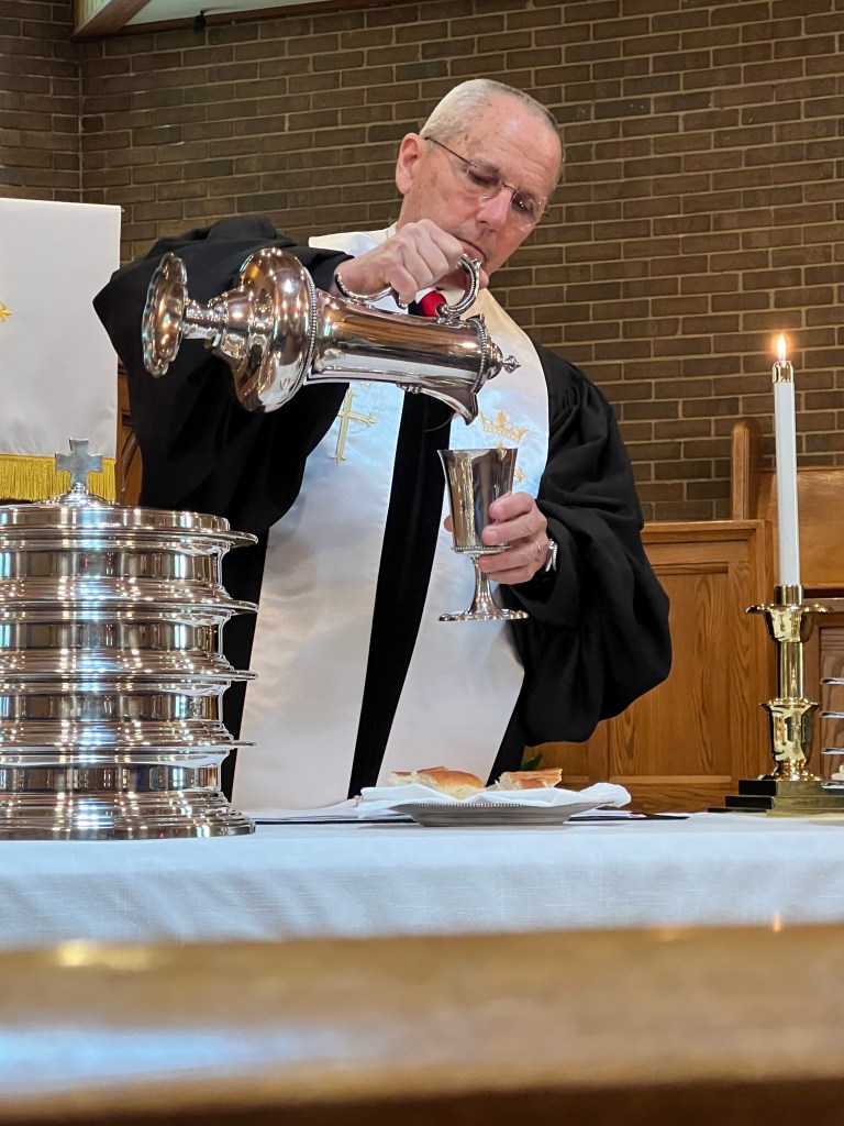 As a Presbyterian we have a tradition of doing communion. Communion is the sharing of bread and grape juice to represent Jesus blood and the bread represent Jesus body. Revered Jeff Cain senior pastor Commerce Presbyterain church is pouring the grape juice into the glass. “This is my blood that has been shed for you take eat drink do so in remembrance of me”.