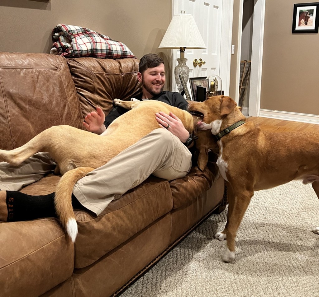 Michael Styles relaxes on the couch and plays with the dogs Ollie and Doc at his in-law’s house on Lake Lanier. Michael is in town visiting for the weekend to spend time with his family for Easter weekend.