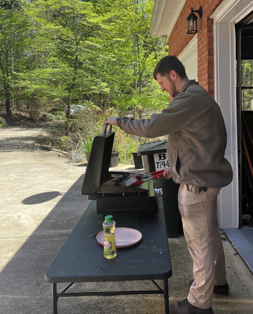 Michael Styles takes a break from relaxing and cooks some ribs on the grill for an Easter Sunday lunch at his in-law’s house in Cumming Georgia. Michael is also enjoying the beautiful weather while cooking outside after a long week of horrible weather.