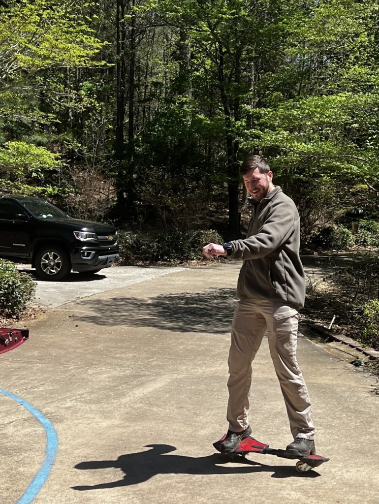 Michael Styles takes break from cooking and reconnects with his inner child and attempts to ride a rip stick on his in-law’s driveway in Georgia on Easter Sunday. It took him a couple tries to get up and going on it, but he was persistent and eventually got it.
