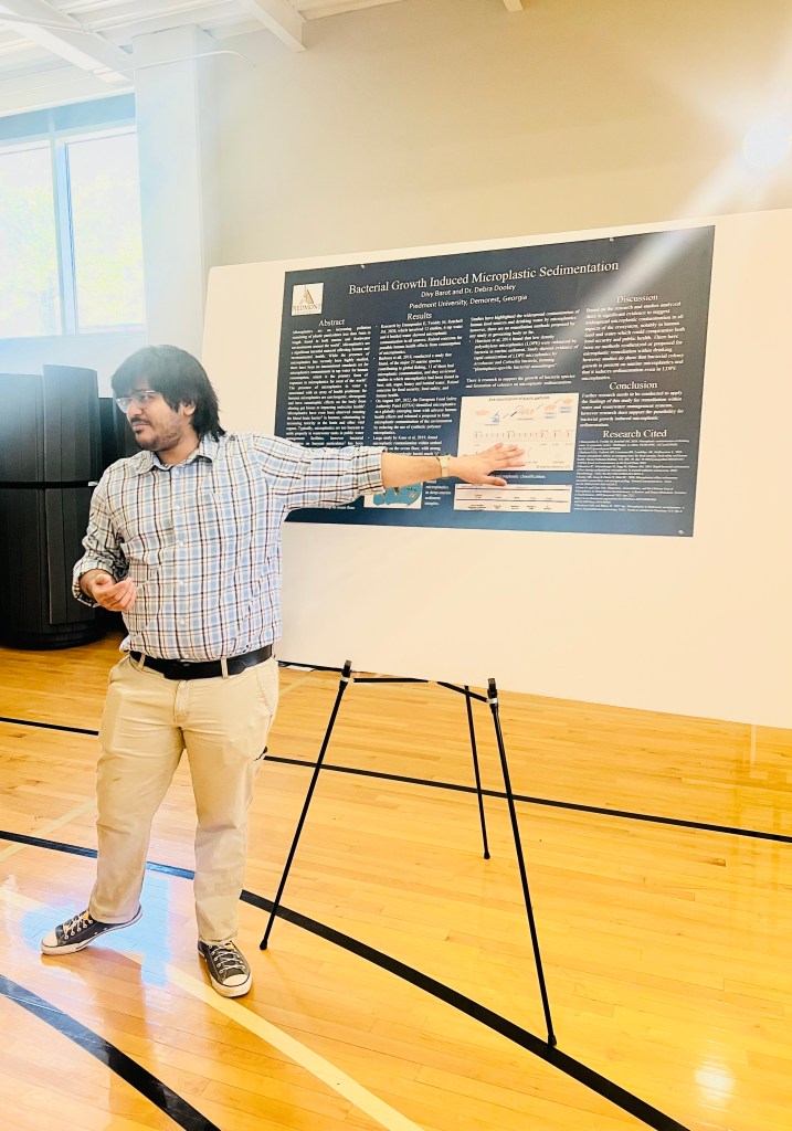 There were also poster presentations that took place in the Commens Gym at symposium held on April 12th, 2023. Divy Barot presenting his poster on Bacterial Growth Microplastic Sedimentation. It is safer to drink out of a metal water verses drinking out of a plastic water bottle.