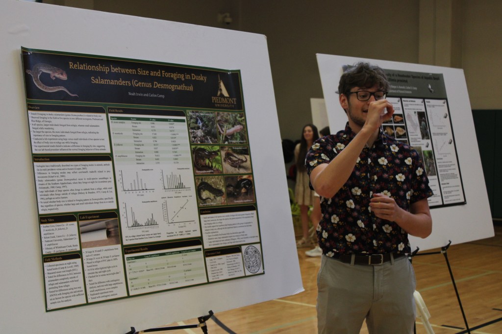 Noah Irwin, a senior at Piedmont University, presents his poster at Piedmont’s 2023 symposium. His poster covered the relationship between size and foraging in Dusky Salamanders.