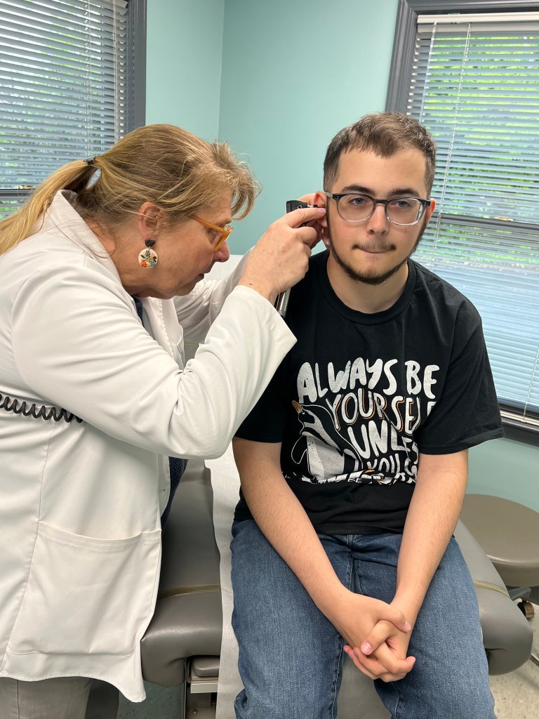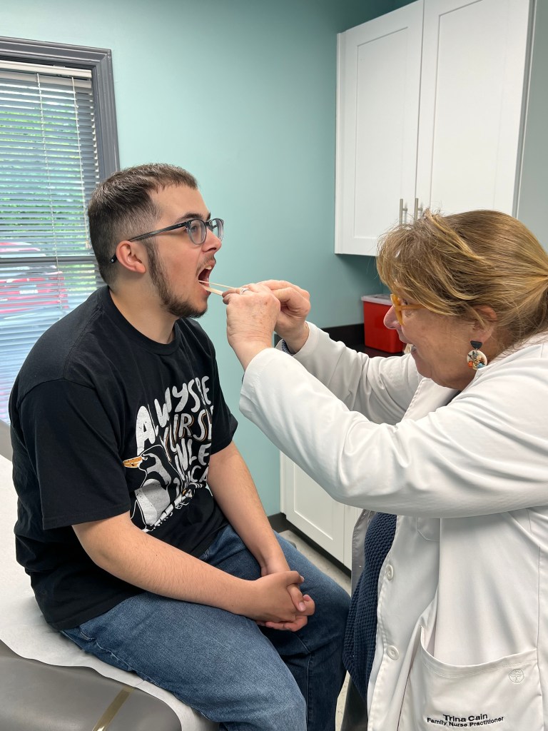 Nurse practinor Trina Cain checking Luke’s throat to make sure it is not strep throat or there is no fluid on the throat or nothinf that will cause a future infection.