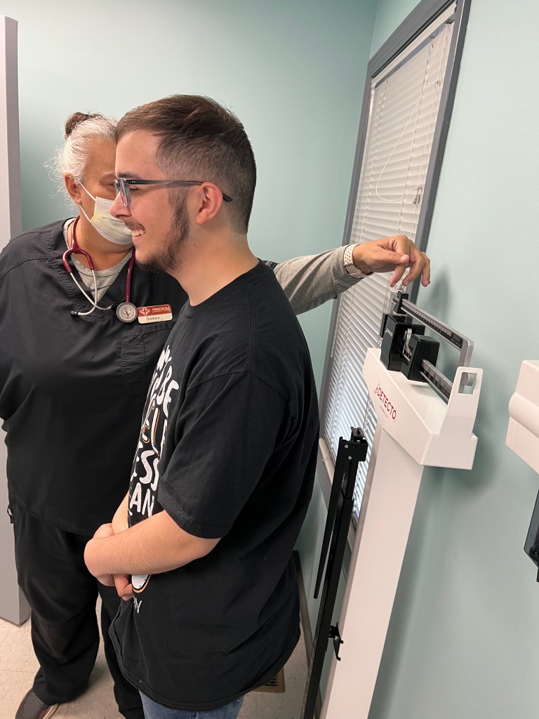 Nurse practinor Trina Cain pictured talking to Luke about what is going on why he came in to be seen. Figuring what she could do to fix the problem.