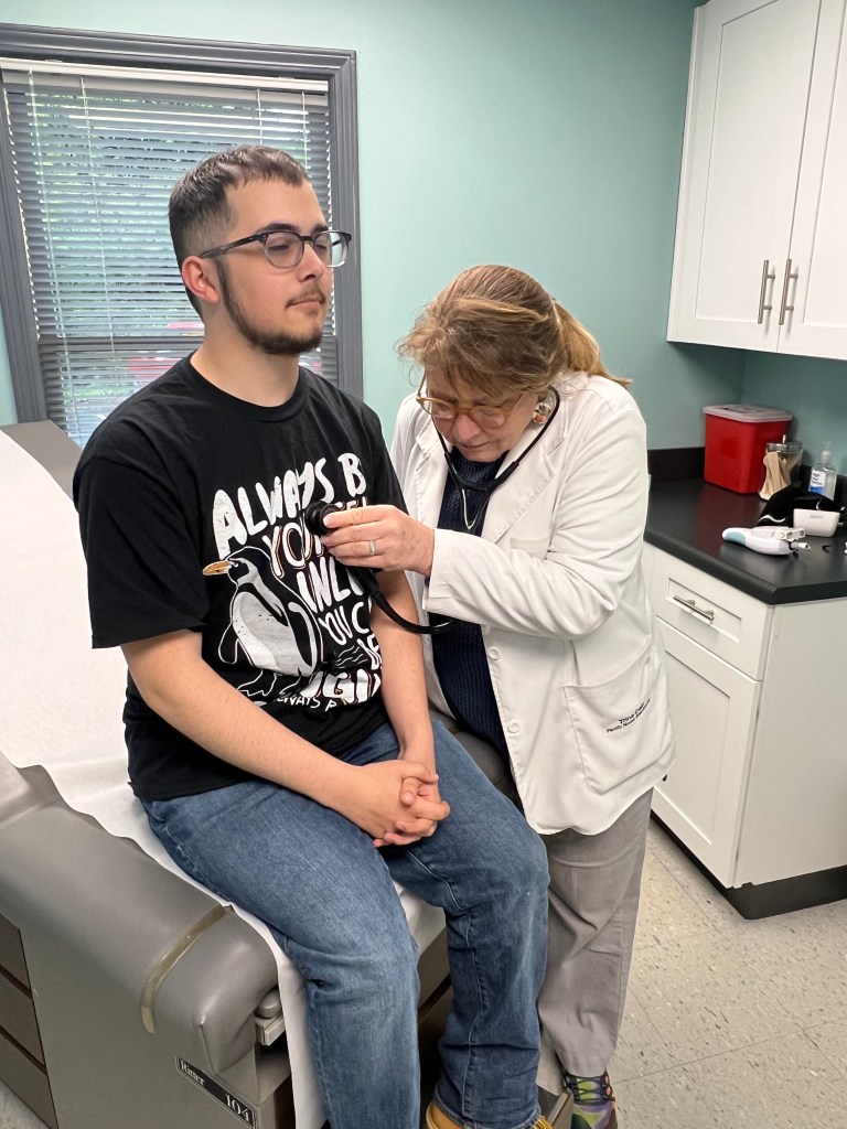 Luke getting his heart listened to by nurse practitioner Trina Cain.