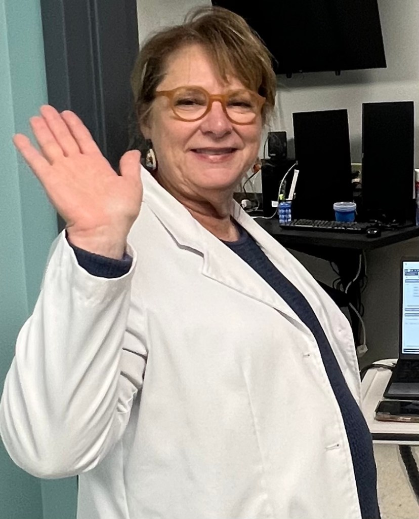 Nurse practinor Trina Cain waving at the camera as she exits the exam room after talking with Luke about how he was going to get treated for his health issues.