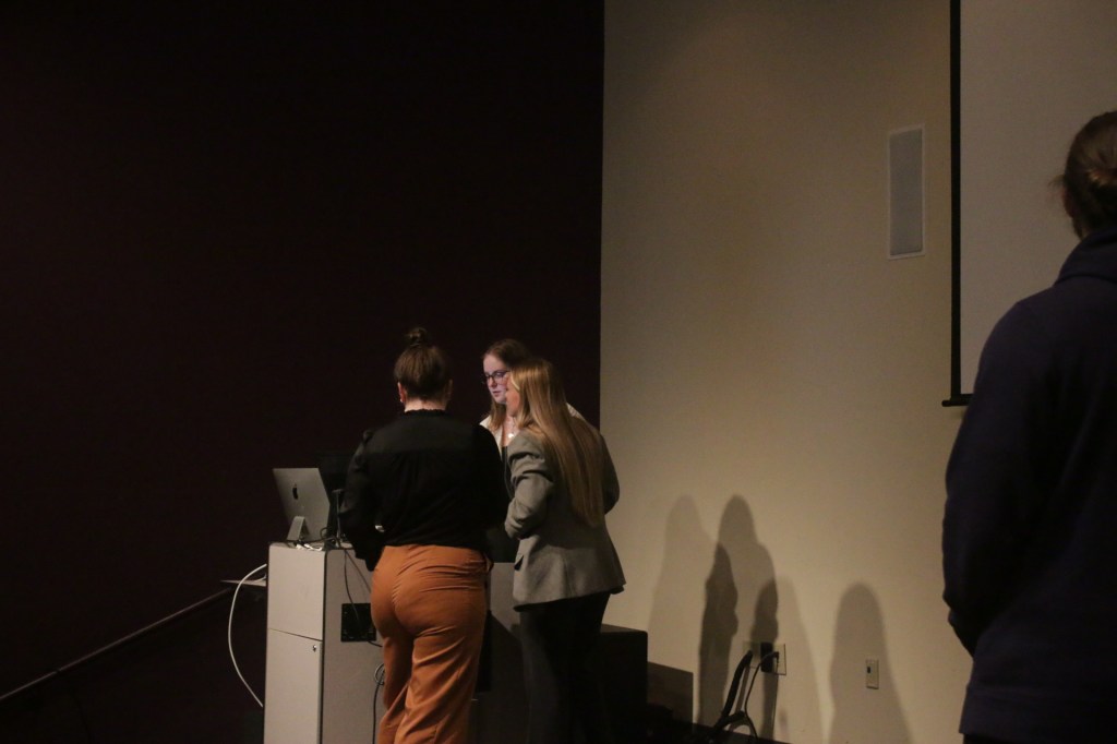 With a team effort from Professor Laura Hudgens(left) Anya Olson(right) and Rowan Edmonds(back), all technical issues are resolved and Murphy’s law is being denied on day one of presentations.