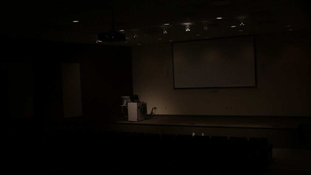 Certain seats within the screening room have been reserved for the esteemed faculty of the Piedmont Mass Communications Department. Pictures above is the spot directly in front of the podium designated for Dr. Janice Moss.