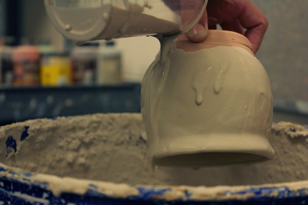 Once the mug has completely dried to the bone-dry stage, Laura Dove will pour glaze onto the mug. From this, Laura can create colorful designs on the side of the mug. And although the colors cannot be seen here, they appear once the glaze has been heated and melted down onto the mug.