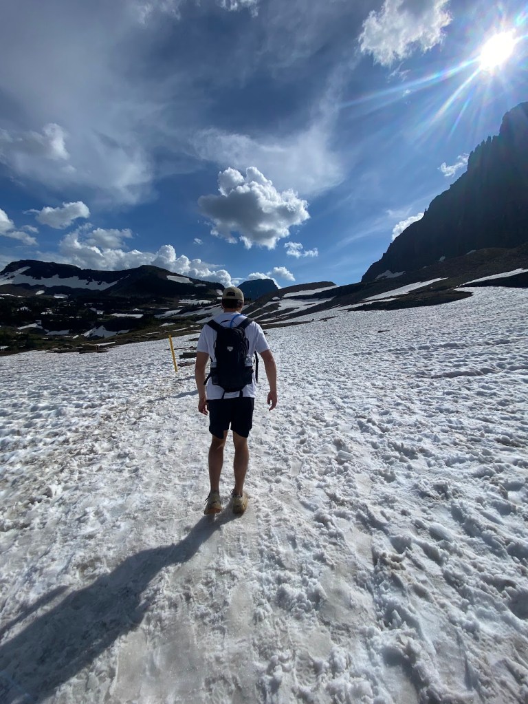 Griffin Kluba hikes across the snow in June in Glacier National Park. The trail was closed the previous week due to bear activity and snow.