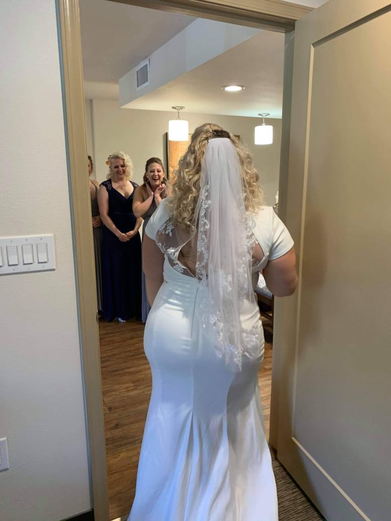 Sydney Kluba emerges from her bridal room to give her bridesmaids a first look at her in her wedding dress. The wedding was held in Scottsdale, Arizona, on Oct. 3rd.