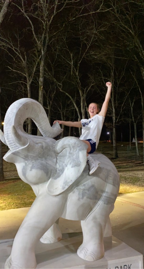 West Forsyth junior Lauren McGarl rides the Gainesville High School mascot statue to celebrate an 8-0 region win. The statue is located right outside of the Gainesville City Park Stadium.