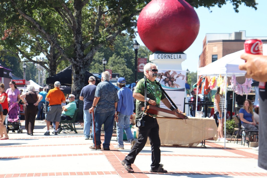 A man known as the Free Range Minstrel is seen performing on the streets at the Big Red Apple Festival in Cornelia on September 23, 2023. You can find the Free Range Minstrel at various festivals, renaissance fairs, and even on Twitch. Listen closely and you might just hear his harmonica on the streets of your next festival!Students Silas Mulligan and Ryan Jolly watch as Hampton Goff anticipates the calling of the next number in a game of Grocery Bingo on August 24, 2023, in the upstairs conference room of the commons. Winners can pick from a table of goodies, and Goff is one call away from Bingo.Professor Drema Montgomery admires a work by sculptor Austin Wieland at his exhibit in the Mason Scharfenstein Museum of Art. Wieland encourages viewers to engage with his works, as the tiles were made to move, so many enjoyed the interactive elements of his work.
