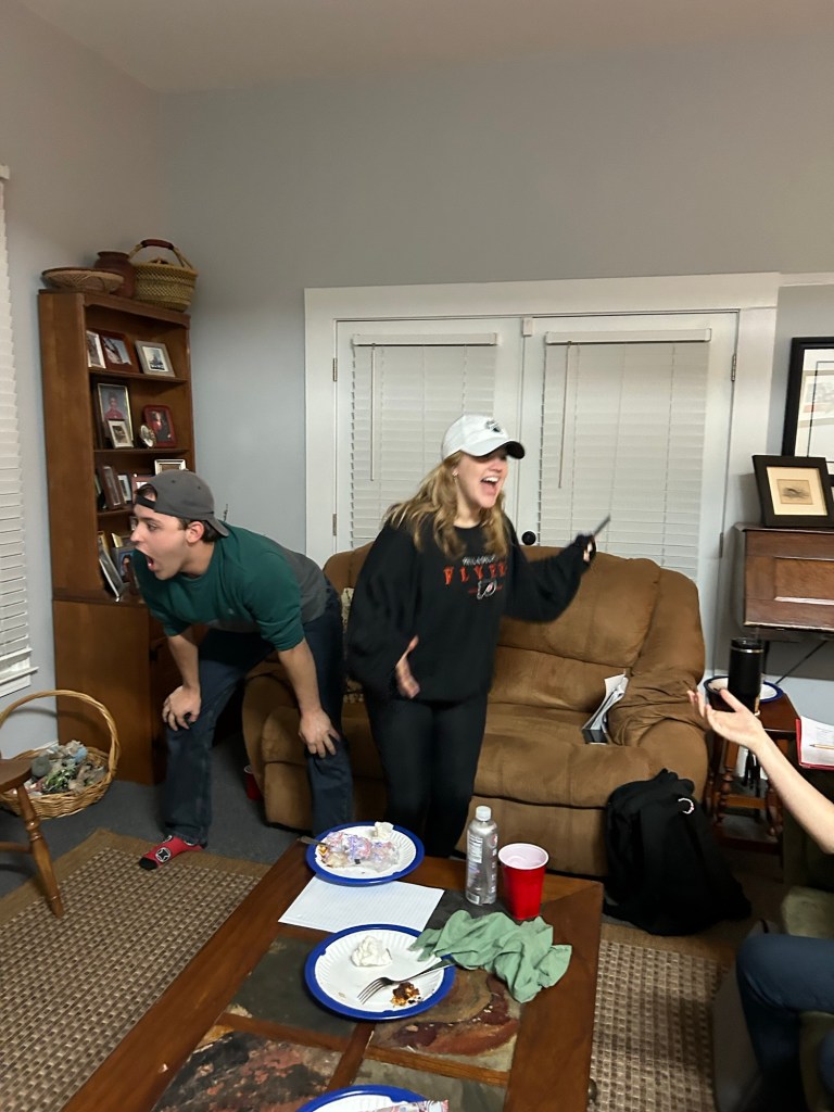 Piedmont University students, Matt Kodrowski (left), Sophie Haines (middle), and Nahomi Solorzano (right) watch the game with their professor Dr. Van Cantfort (not pictured) at his Athens home. While enjoying food and the game, Dr. Van Cantfort’s Advertising students worked on their first video project.